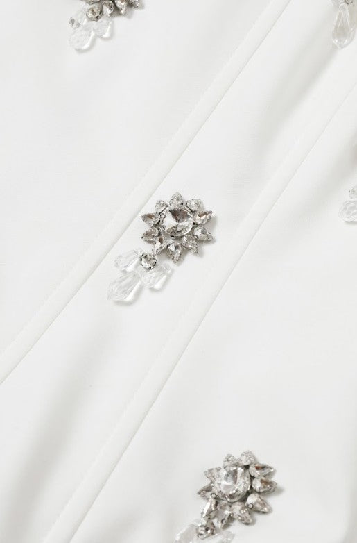 This white corset top with rhinestone embellishment is a show stopper! Pair it with jeans or the matching embellished skirt for a fun stylish look!