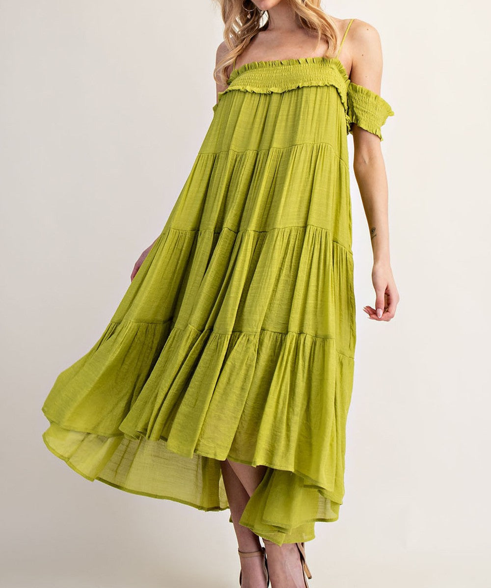 The solid smocked midi dress featuring adjustable spaghetti straps, a smocked chest detail with smocked cuffs creating an off the shoulder effect, is lined and is a tiered and flowy body.